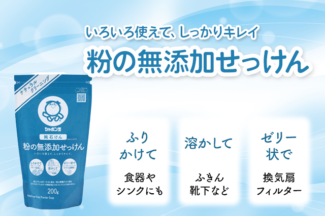 濡れたスポンジに粉石けんを直接ふりかけて、充分に泡立てて使用する。